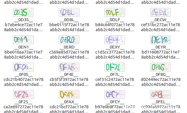 如果对试验CNN效果感兴趣,可以直接用第三方标准库无限生成带标记图片。但是如果在具体的场景使用,则需要准备大量的带标记数据,像复杂型图片验证码,如果要达到90%以上的正确识别率,则需要5万带标记数据。下图是生成的部分先验数据集: