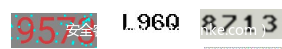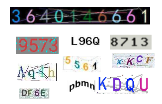 比如像下图中的验证码,无论它们的色彩、字体及干扰项如何变化,字符之间容易分割的事实是无法被改变的。也就是说,此类验证码可以很容易将一个本来要判定N位字符串的问题简化为“判定1位字符,然后将N个这样的图片再组合起来”。这样网络的复杂度可以大大的简化,训练所需要的样本数量及训练时长都会大量减少。