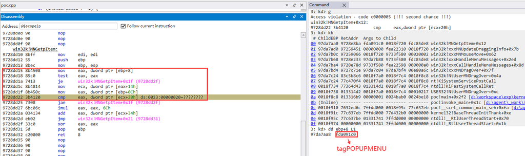 可以看到,user32! NtUserMNDragOver在user32! NtUserMenuItemFromPoint + 0x3A处,对应PoC代码: