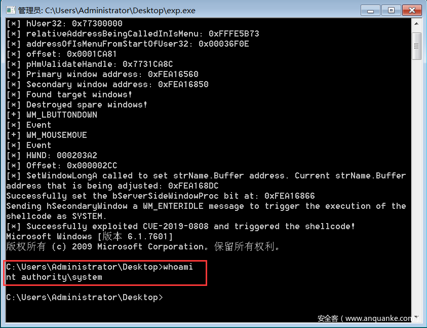 最后执行shellcode,成功替换system进程token,实现提权: