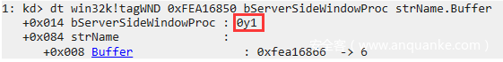 通过窗口对象喷射,我们得到两个相邻的窗口对象,并可以利用漏洞修改第一个窗口对象的cbwndExtra实现第一个窗口对象附加数据越界读写功能。我们最终的目的是在内核态执行用户态的shellcode,窗口对象tagWND. bServerSideWindowProc标志位可以帮助实现此功能。如果tagWND. bServerSideWindowProc 被置位则窗口过程函数直接在内核上下文执行,而通过之前的窗口喷射我们已经可以通过第一个窗口的附加数据越界修改第二个窗口的strName.Buffer字段,通过将第二个窗口的strName.Buffer指向第二个窗口的bServerSideWindowProc,最终可以利用第二个窗口strName修改第二个窗口对象的bServerSideWindowProc标志位: