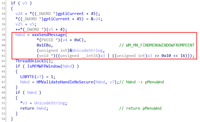 这里通过xxxSendMessage函数像用户态发送WM_MN_FINDMENUWINDOWFROMPOINT(0x1EB)消息获取窗口句柄,并通过HMValidateHandleNoSecure函数将窗口句柄转为内核态窗口对象返回xxxMNMouseMove函数。