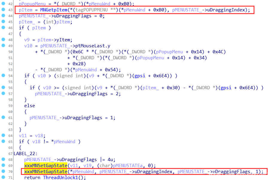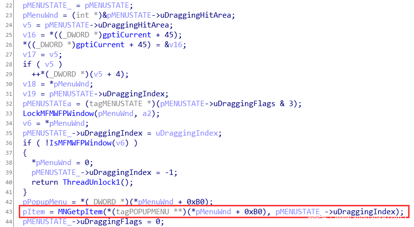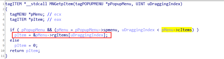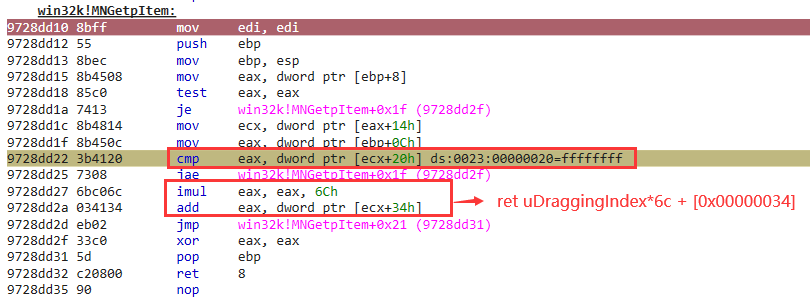 这次uDraggingIndex < pMenu->cItems=0xffffffff 成立,进入if成立分支,并注意到函数返回值eax = uDraggingIndex * 0x6c + [0x00000034],其中[0x00000034]可控。如果uDraggingIndex的值也可以泄露的话,MNGetpItem函数的返回值就用户态可控。