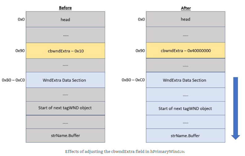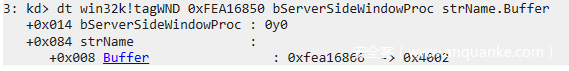 通过第一个窗口cbwndExtra越界修改第二个窗口的strName.Buffer,将其指向第二个窗口的bServerSideWindowProc标志位: