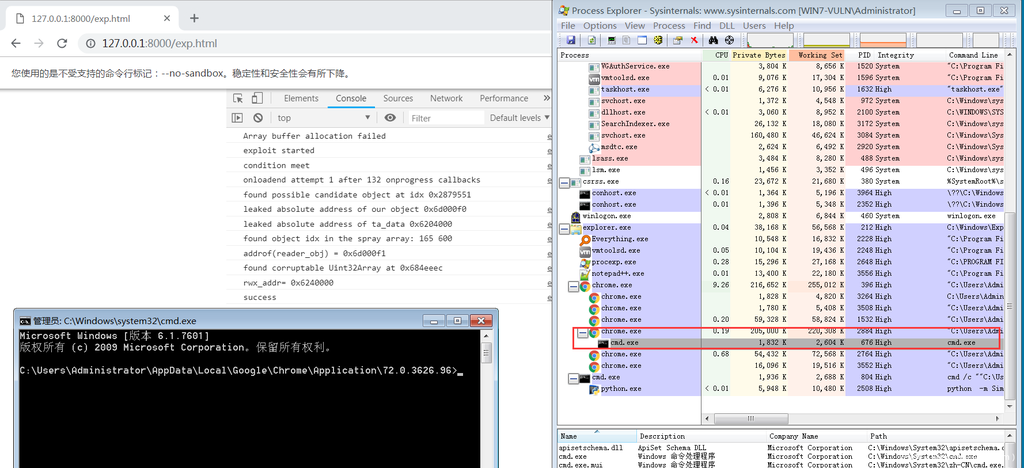 同样方法编译CVE-2019-0808的exp,可以实现沙箱逃逸,完整的利用代码可以参考Exodus的github。感兴趣的同学可以自行尝试。