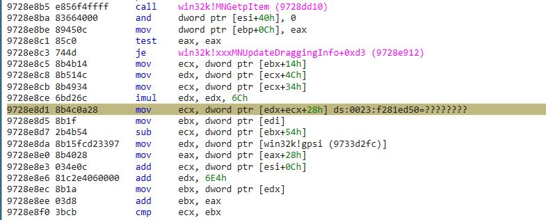 继续执行,进入xxxMNUpdateDraggingInfo函数的MNGetpItem函数,因为此时spmenu(ecx)= NULL,从而触发空指针解引用异常,最终导致BSOD: