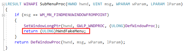 该if分支中通过SetWindowLongPtr替换窗口的默认过程函数DefWindowProc为SubMenuProc,从而进入SubMenuProc: