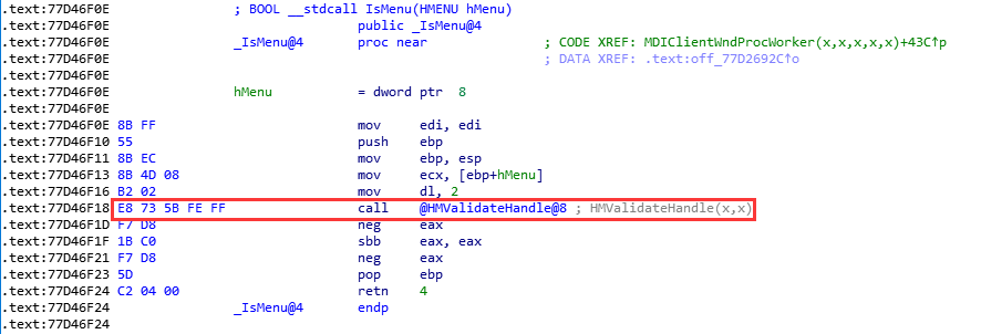 但是user32!HMValidateHandle并未导出,因此需要借助其他导出函数寻找,这里选择的是user32! IsMenu: