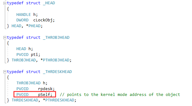 窗口对象喷射有一个需要解决的问题是如何在用户态泄露内核态窗口对象指针。user32!HMValidateHandle可以用来泄露内核对象地址,user32! HMValidateHandle用来返回窗口句柄的THRDESKHEAD结构体,而THRDESKHEAD.pSelf属性保存了该句柄的内核对象地址: