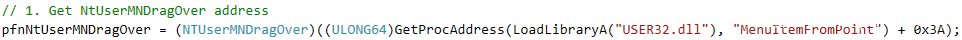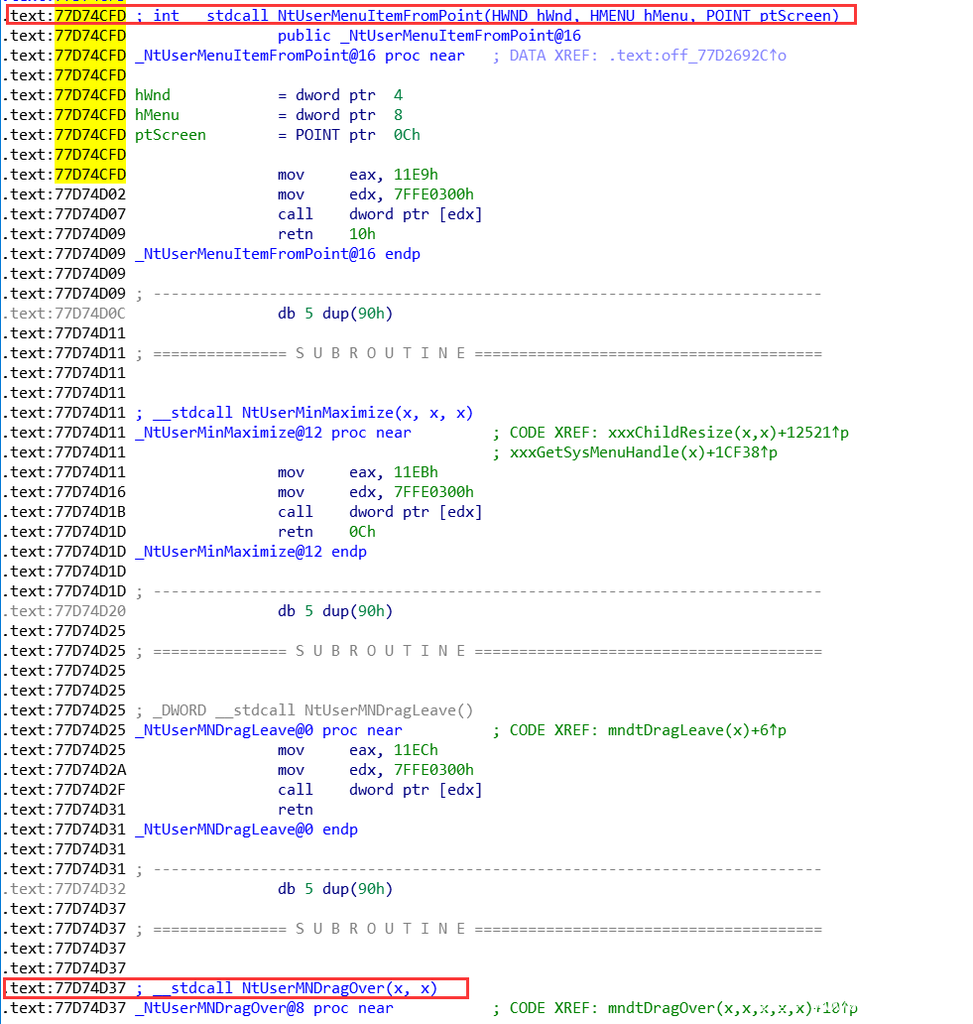 win32k!xxxMNMouseMove由win32k!xxxMNDragOver调用,而win32k!xxxMNDragOver由用户态user32! NtUserMNDragOver调用。由于user32! NtUserMNDragOver未导出,因此可以通过user32! NtUserMNDragOver附近导出函数地址+偏移的方式获取。这里选择user32! NtUserMenuItemFromPoint: