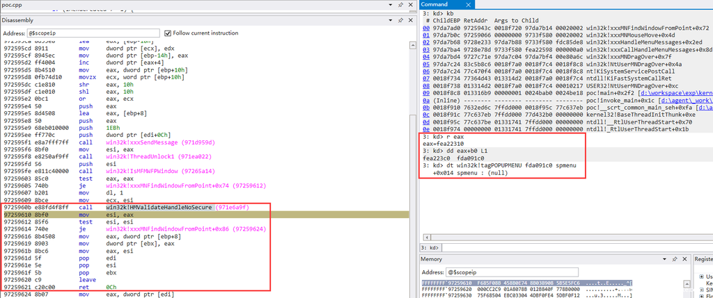 可以看到返回的正是用户态构造的窗口对象句柄0x00020284。继续步过,win32k!HMValidateHandleNoSecure返回对应的内核对象tagWND地址0xfea22310。根据之前的分析,tagWND+0xb0 -> tagPOPUPMENU=0xfda091c0 ,而tagPOPUPMENU+0x14->spmenu = NULL满足漏洞触发要求: