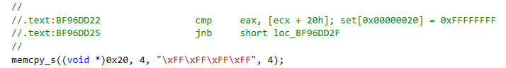 由于零页内存可控,考虑设置[0x00000020]=0xffffffff: