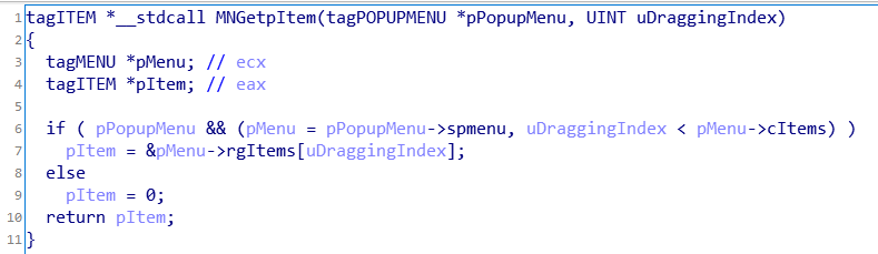 xxxMNUpdateDraggingInfo函数内部首先调用MNGetpItem根据pMENUSTATE_->uDraggingIndex返回对应的tagITEM,跟进MNGetpItem函数: