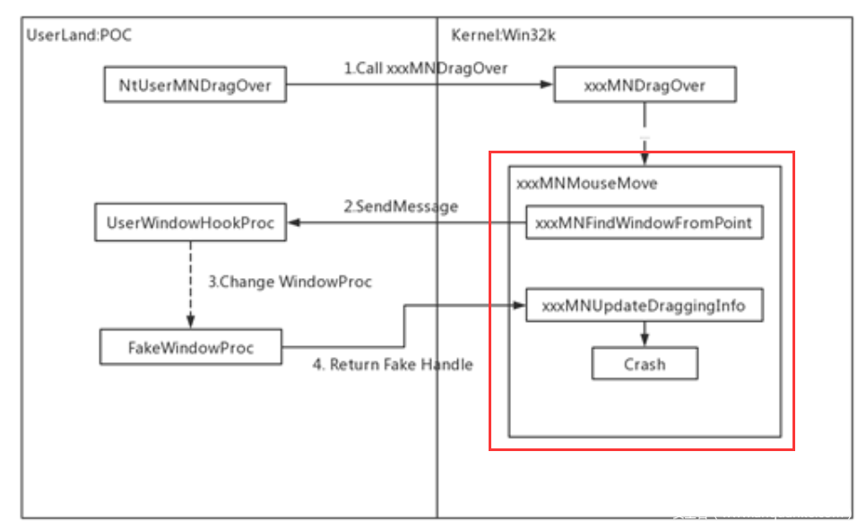 那么如何返回一个(tagMENUWND +0xb0)->pPopupMenu->spmenu = NULL的窗口对象呢,关键在于xxxMNFindWindowFromPoint函数中的xxxSendMessage函数调用。Windows API提供了SetWindowsHookEx和SetWinEventHook这样的消息/事件钩子API用来截获窗口的消息/事件,因此可以通过设置SetWindowsHookEx和SetWinEventHook函数利用xxxSendMessage向用户态发送WM_MN_FINDMENUWINDOWFROMPOINT消息的机会,创造一个内核态到用户态的回调,从而打破内核态中xxxMNMouseMove中的原子操作,返回用户态伪造的窗口对象。