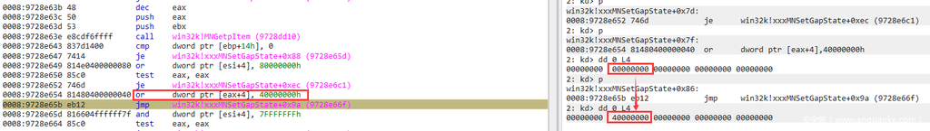 再次调试,成功步过之前的crash点,最终将0x00000000的值修改为0x40000000