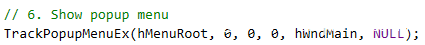 TrackPopupMenuEx会调用内核函数xxxTrackPopupMenuEx。xxxTrackPopupMenuEx首先会调用xxxCreateWindowEx创建菜单对象tagMENU对应的窗口对象tagWND(tagMENUWND)和弹出菜单窗口对象tagPOPUPMENU,其中tagWND+0xb0 -> tagPOPUPMENU,tagPOPUPMENU + 0x8 -> tagWND(spwndPopupMenu), tagPOPUPMENU + 0x14 -> tagMENU(spmenu);接着调用xxxSetWindowPos设置菜单窗口的坐标;最后调用xxxWindowEvent发送EVENT_SYSTEM_MENUPOPUPSTART事件表示菜单弹出开始。