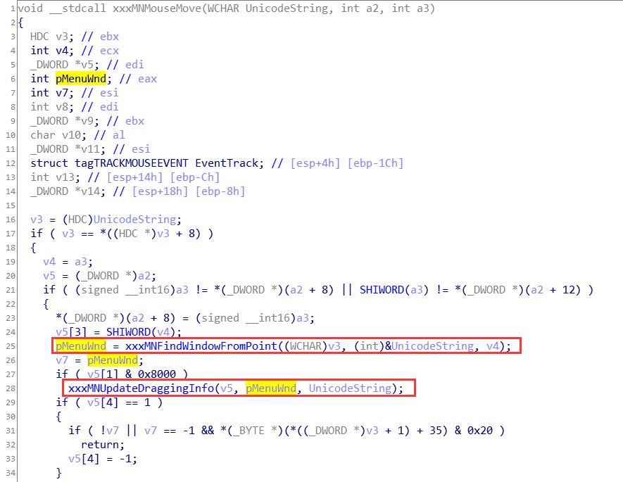 可以看到,xxxMNMouseMove函数中首先通过xxxMNFindWindowFromPoint函数根据当前输入坐标返回对应的窗口对象,然后通过xxxMNUpdateDraggingInfo函数更新窗口拖动信息。跟进分析xxxMNFindWindowFromPoint函数: