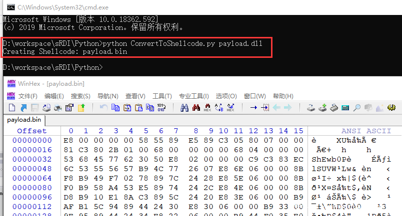 vs编译选择最大优化并选择/MT模式生成payload.dll。使用sRDI的python模块生成bin文件: