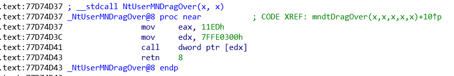 这里11ED是NtUserMNDragOver对应的syscall编码,[7FFE0300h]保存的是ntdll!KiFastSystemCall函数地址。