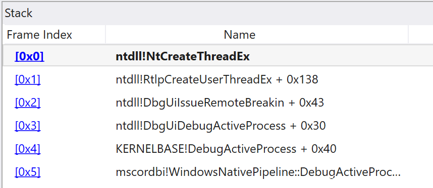 上述情况还是仅适用于在现有的进程中寻找.NET代码。如果像上文的最后一个示例那样,我们连接调试器来启动新的.NET进程,那么就不会看到这个远程线程的创建,因此无法检测到。这是因为通过DEBUG_PROCESS的CreateProcess选项创建初始调试器会话的方式,在此过程中从来不会使用ntdll!NtCreateThreadEx调用。但是,如果后续使用了DebugBreakProcess这样的调用,也会导致被检测到。