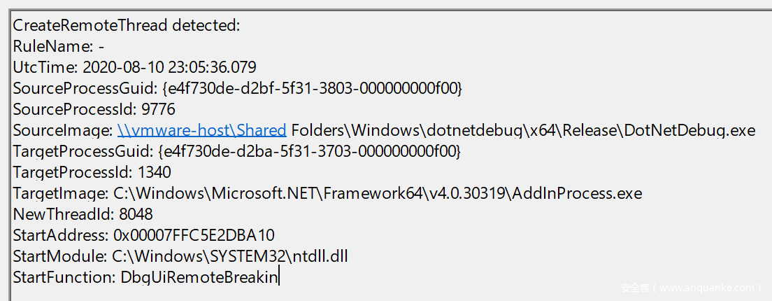此外,Sysmon提供了一个不错的CreateRemoteThread指示器,可以将入口点显示为DbgUiRemoteBreakin,对于防御者来说可能很有帮助。