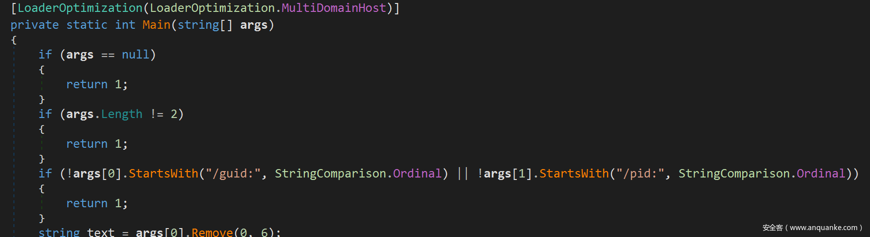 我们可以看到,在执行注入eventvwr.exe之类的进程时,执行.NET Payload非常容易,所以可以针对目标进程本身定制注入。这里以与.NET框架捆绑在一起的另一个.NET进程AddInProcess.exe为例,如果我们对其进行反编译,会发现它有两个参数: