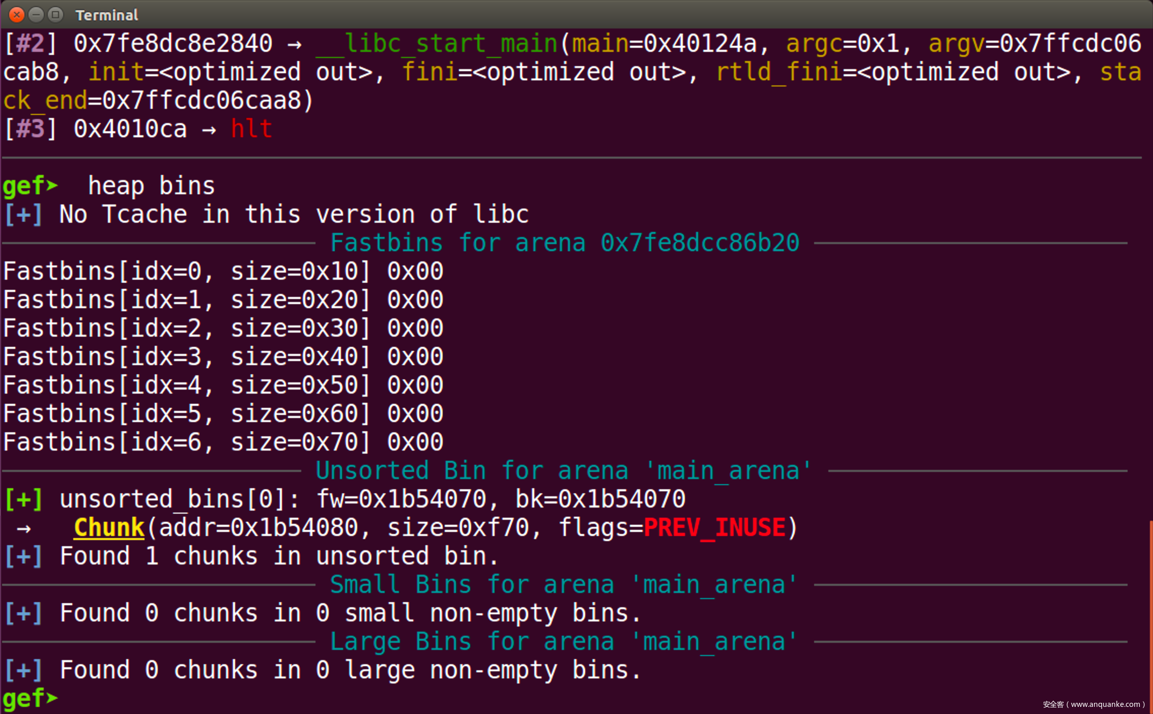 现在,我们成功的向unsorted bin加入了chunk,接下来我们取回,即可泄露libc