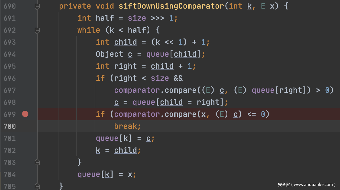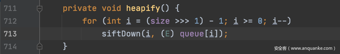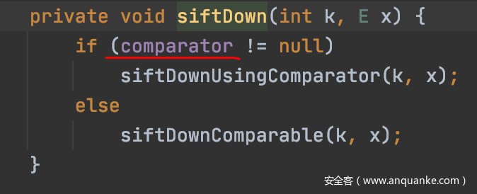 所以如果队列中的元素是构造好的反序列化利用链,那么就可以直接触发该链执行命令。但这个毫无意义,继续分析readObject最终会调用heapify函数,该函数将无序数组 queue 的内容还原为二叉堆( 优先级队列 )