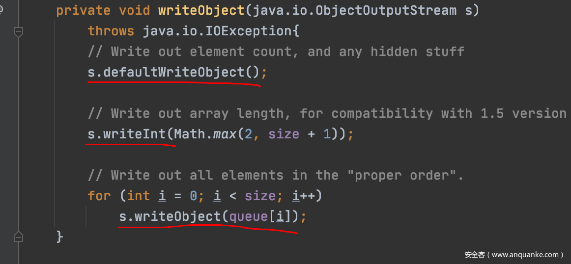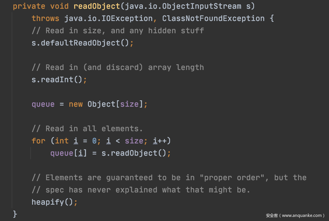 可以直观的看出在该函数中s.defaultReadObject()调用默认的方法,利用readInt读取了数组的大小,接着通过s.readObject()读取Queue中的元素,因为在反序列化的时候队列元素也被序列化了