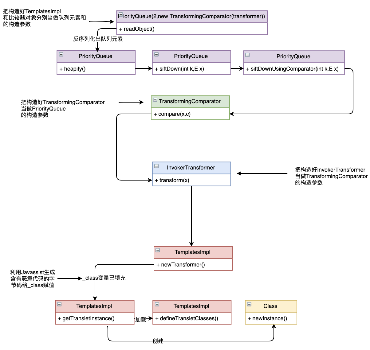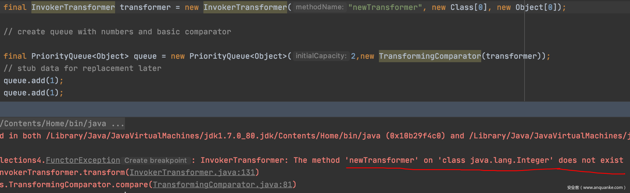 其中有一步修改transformer对象的iMethodName值,是因为要触发TransformingComparator的newTransformer方法,调用命令执行链。最后将队列的0号元素改为命令执行链入口类。