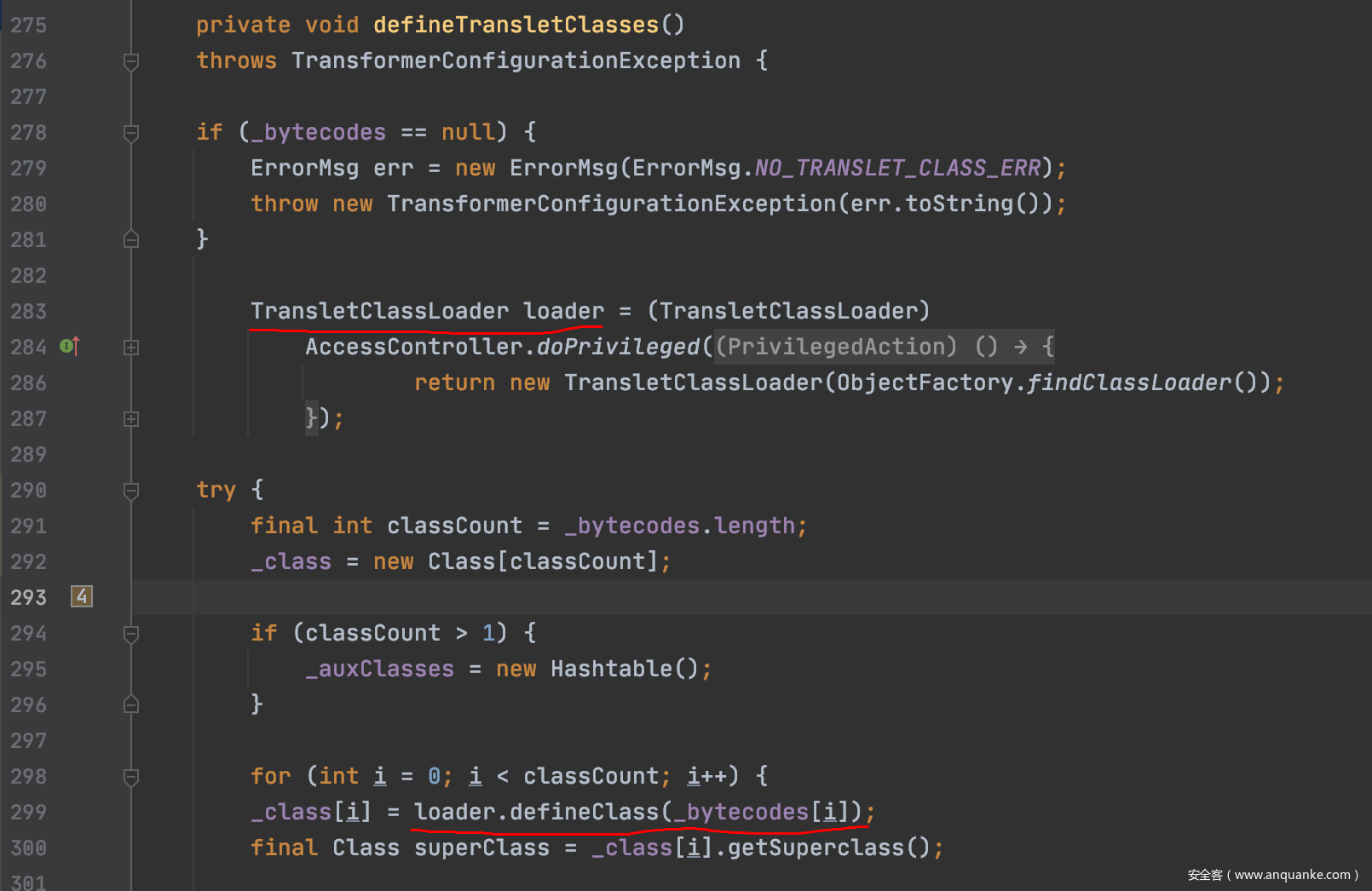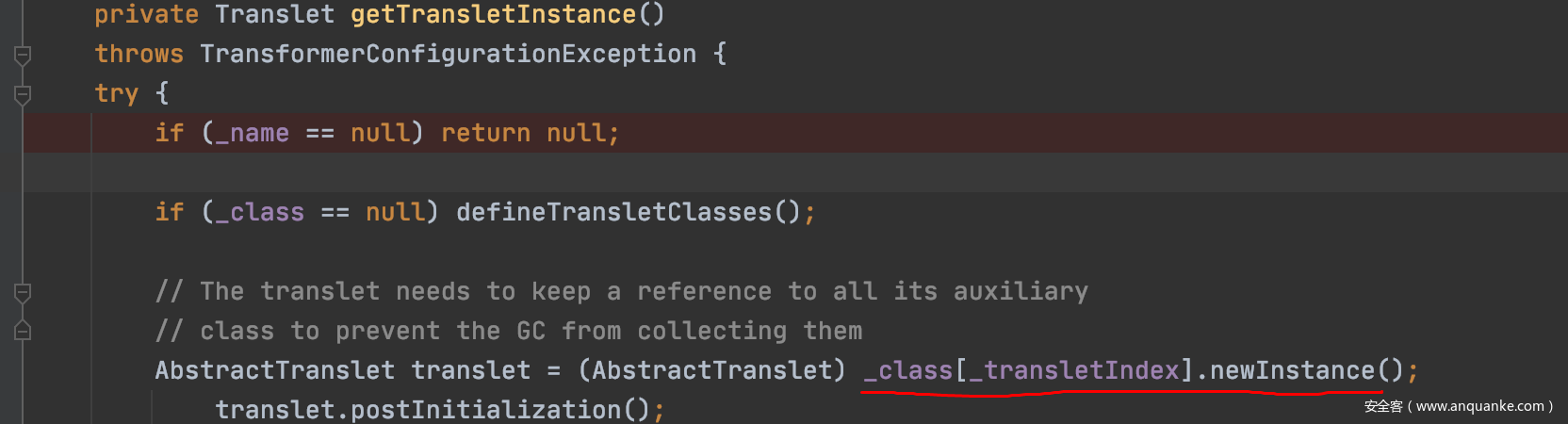为什么是这个类,这里就有讲究了,在TemplatesImpl类中存在加载字节码并创建实例的函数