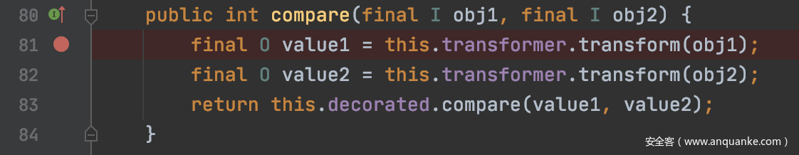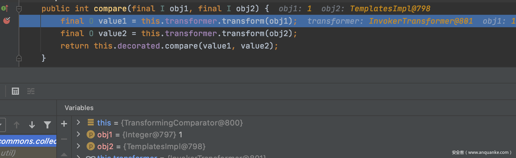 正如之前分析的一样,将transfomer作为TransformingComparator的构造方法将TransformingComparator作为invokerTransformer的构造方法。