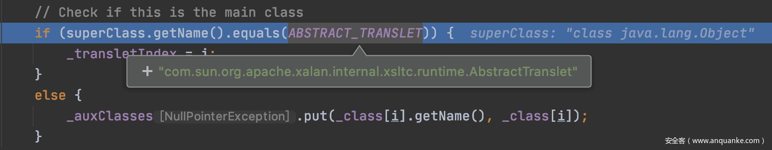其原因在于判断了其父类的名字是否等于com.sun.org.apache.xalan.internal.xsltc.runtime.AbstractTranslet,