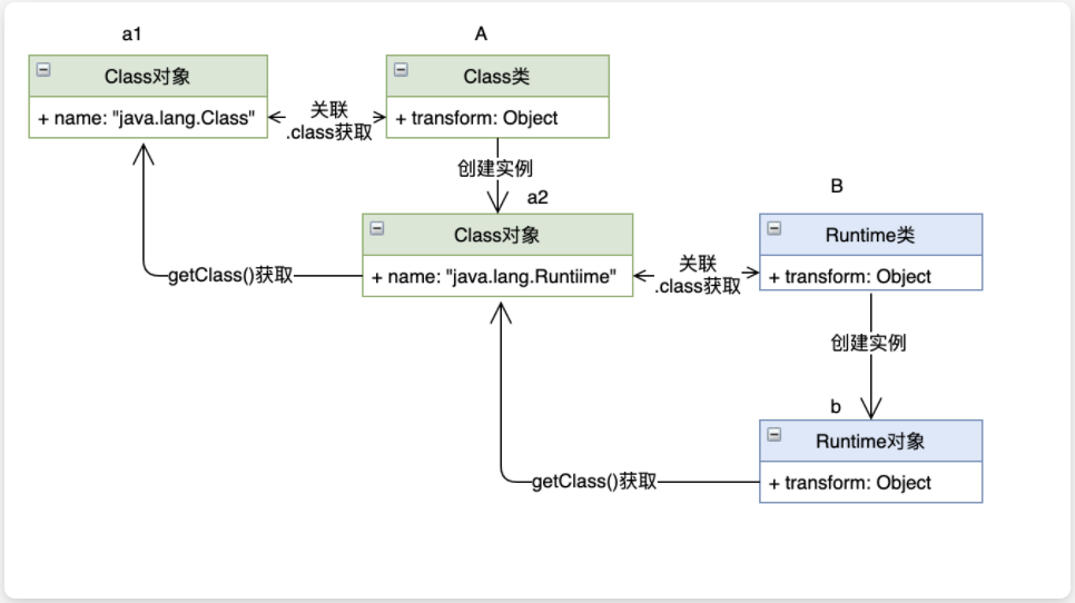 回顾之前介绍的Class类(如下图所示),它是保存类信息的类,在每个类生成之前会与Class对象进行双向绑定。可以通过这个Class对象a2获取到关于它关联类B的相关方法类和属性类。