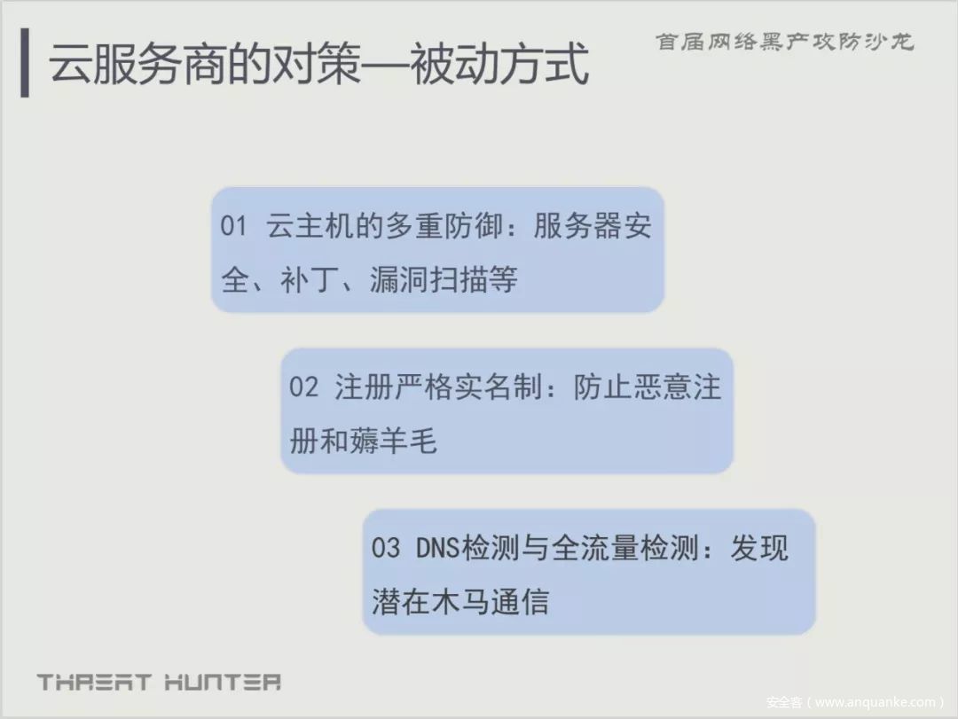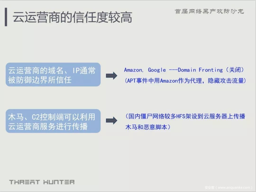 云服务商的域名通常被防火墙或者各种安全策略标记为可信任。如果把恶意软件,或者是控制端放在云上的话,很有可能被对方的防火墙给放掉。这也是云服务商面临的一个新的问题。像木马的控制,他们会利用云服务商的主机来制作、生成和分发这种木马。当然,对于云服务商来说,我们也会对我们的服务进行样本扫描和检测,来发现这种大量传播的恶意木马和脚本。