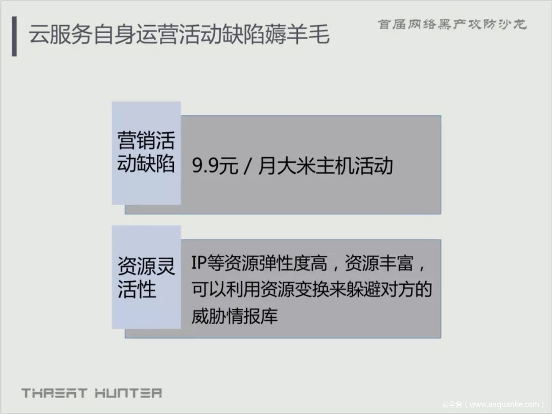 云资源的获取可以通过漏洞的方式来非法获取,还有一种是云服务自身的运营活动导致被薅羊毛。比如说我们金山云去年做了一个每月9.9元的大米主机活动,这个活动毫无意外地会招来羊毛党的觊觎。