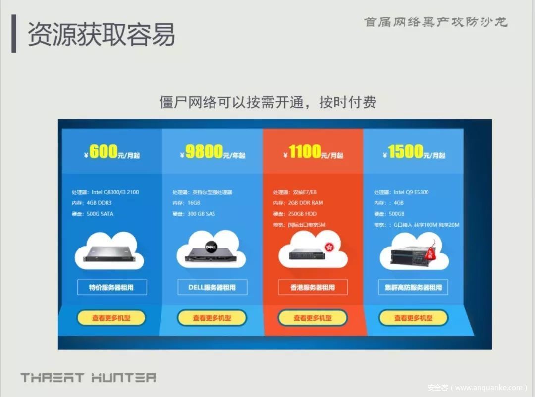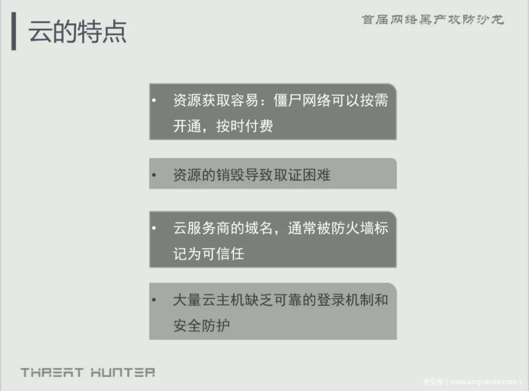云的资源获取容易,僵尸网络可以按需开通,按时付费。比如可以自己买一台云的资源,而且这些云主机缺乏监管,在云上的价格很低,可以按月来开通。相比传统的方式,在成本上对僵尸网络的拥有者是很大程度的降低。这实际上是大部分的僵尸网络利用了云的可扩展性。