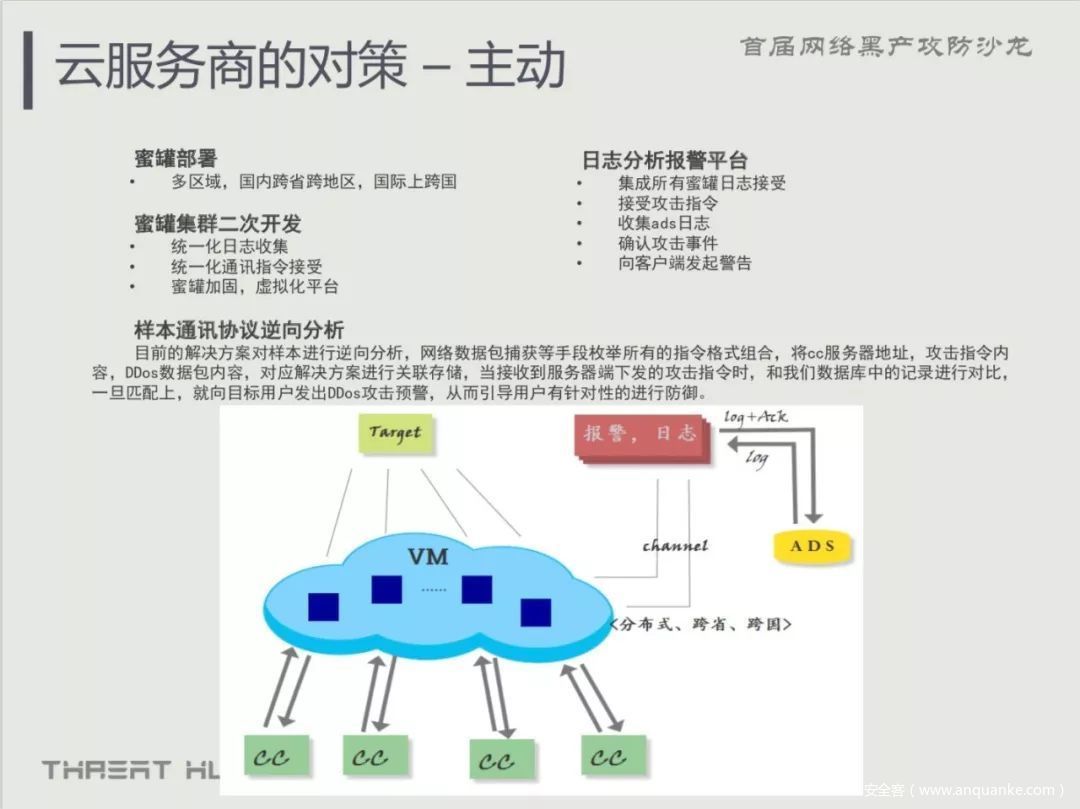 我们在互联网上部署了蜜罐,主要监控各种木马家族。这些蜜罐通过多区域,国内跨省跨地区,国际上跨国进行部署,可以接收攻击指令,确认攻击路线。如可以在DDoS攻击发起前几分钟之内就能够发现。DDoS从下发指令准备到攻击也是需要一定的时间的。因此,主动的探测对于这种攻击网络还是很有效的。