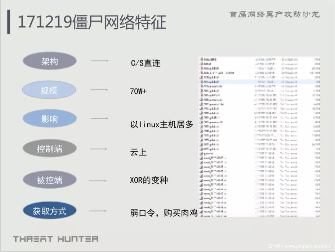 从僵尸网络的架构上来看,相对于P2P的攻击方式,这些僵尸网络并没有特别出彩的地方,这取决于一个普通的C/S直连的方式。它通过C/S直连的加密协议,直接连到这个控制端,再经过多重的跳转。在云时代,不光是通过C/S直连的方式,还有通过DNS隧道传递数据的方式来对控制端进行连接,这种规模还是相当大的。