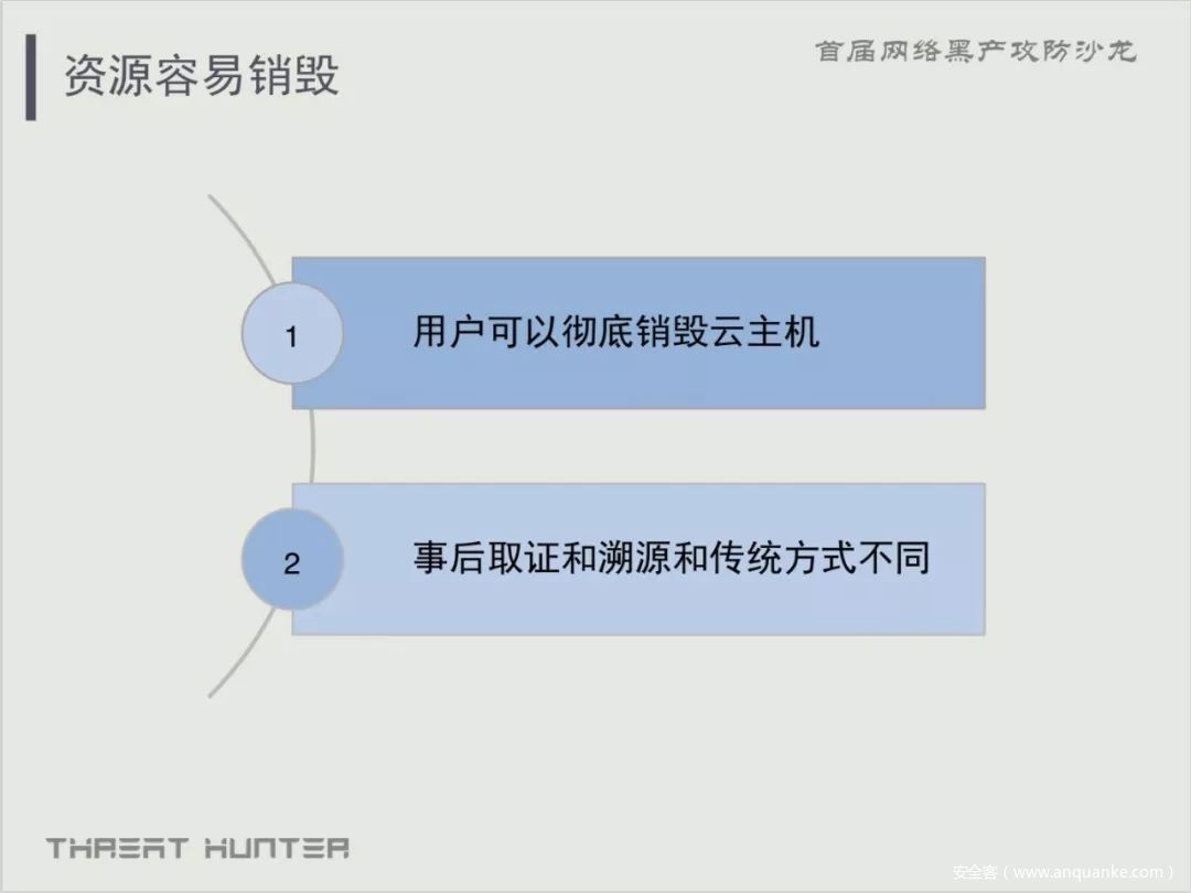 资源的销毁会导致取证困难。传统的IPC,物理机是不能销毁的,但在云服务里用户可以彻底撤销云主机。现在公安部也在制定关于云端取证的标准和规定,目的也是为了让运营商可以保留足够的取证的证据。另外,事后取证、溯源和传统的方式不同,也增强了查杀和防御的难度。