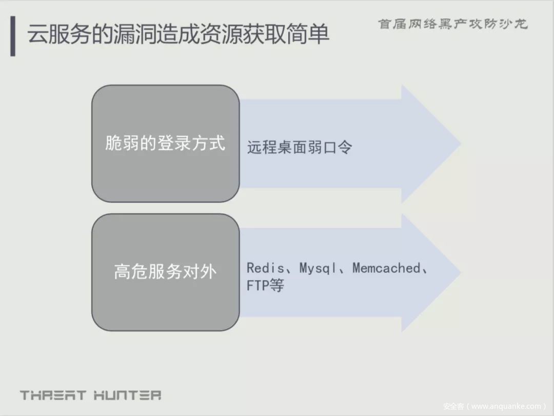 云主机缺乏可靠的登录机制和安全防护,导致黑客容易获取到资源。用户从传统的服务器迁移到云上来,因为各个云的安全水平是不一样的,它能提供给用户的安全基线也是不一样的。所以如果用户不了解云防护或者云安全的边界,可能会采用弱口令等方式登录,造成登录方式脆弱。另外,用户还可能暴露一些高危端口。那么,黑客会利用这种漏洞和错误的配置来批量入侵用户的主机。所以云服务商和用户必须共同努力提升自己服务的安全基线,来增强黑客获取资源的难度。