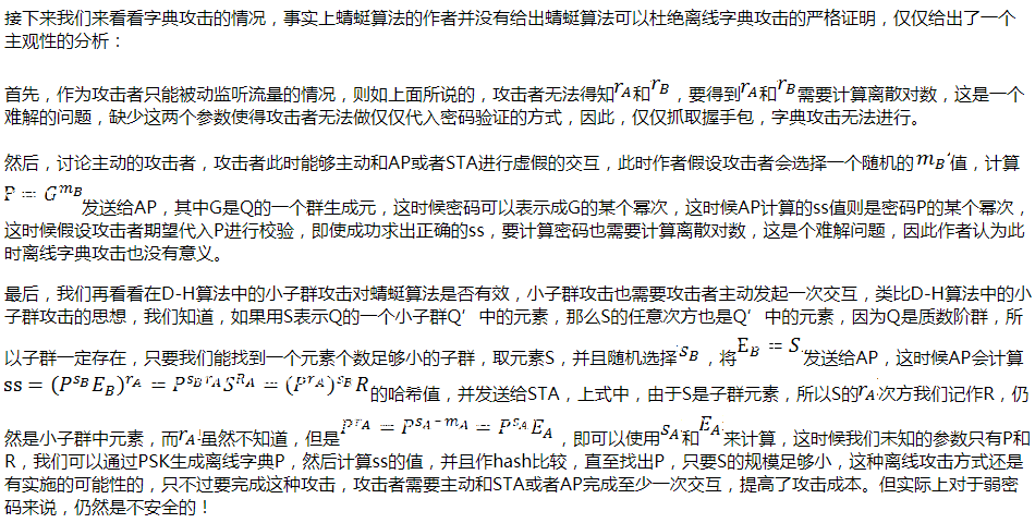 上面就是WPA3中蜻蜓密钥交换算法的主要内容了,由于WPA3尚未大规模商用,因此有很多实现细节还尚不清楚,要真正的实际使用还有很多工程方面的工作需要考虑,这些不是本文所关心的。因此后面我们仅做一个理论性的讨论,上面的过程是对RFC7664里面所述协议的简化模型,源文档写的非常冗长,但核心就在上面的过程里,如果对协议细节有兴趣可以参考原文档。