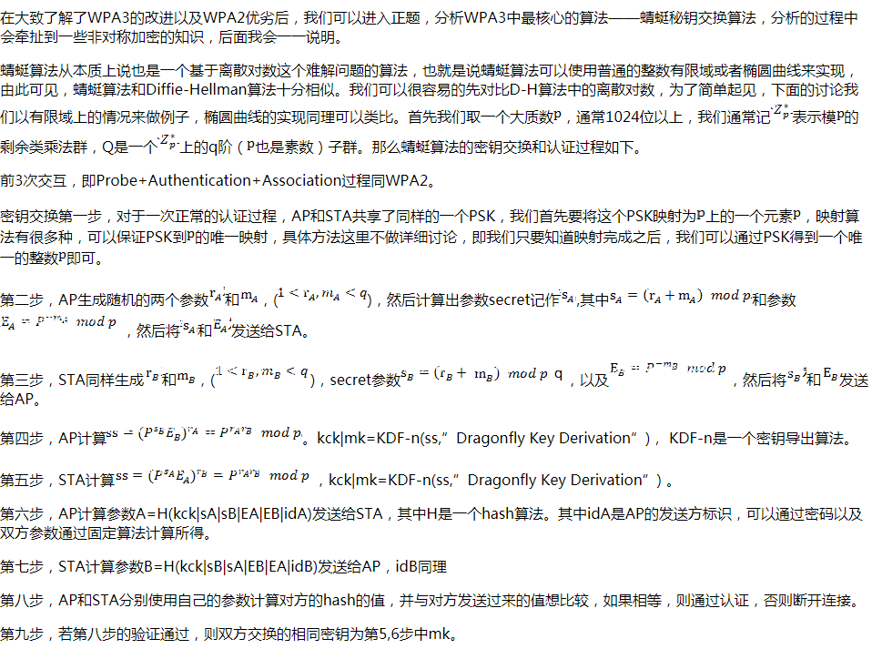 其中官方宣称的第1点建立的基础就是因为引入了蜻蜓秘钥交换协议,该协议作者在该协议的说明中声称可以避免离线字典攻击,这一点应该就是以上第1所述的可保护弱密码的原理。至于3,其实128位的对称密钥已经足够,此处提升仅仅有理论上的安全提升。看来WPA3上最明显的改进就是替换了密钥交换算法,在接下来的章节中我们就着重分析一下这个蜻蜓算法。